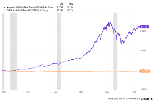 Had you instead invested your $850 in an S&P 500 mutual fund in 1980 (there weren’t many to choose from, but Vanguard had one) and reinvested all dividends, it would have been worth approximately $13,000 in 2005.  This chart from Y Charts compares the price of gold to the S&P 500 index over that period.  The shaded areas represent recessions.  The S&P 500 index is in purple.  The price of gold is in orange: