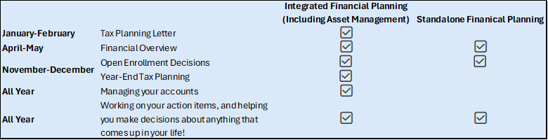 In addition to responding when you have a need, we are behind the scenes monitoring your investments and your plan whether you are calling us or not. Throughout the year, we are looking at your action items, your investment accounts, your estate planning concerns, your insurance needs, your tax situation, and all the other areas of your financial plan.