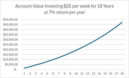 Even putting $25 per week into an account for 18 years will lead to nearly $50,000 with a 7% growth rate. A $25 weekly contribution may not feel like much, but having $50,000 to use for college or another goal would be very helpful! The fact that the $25 per week doesn’t feel like a sacrifice means that you probably won’t ever stop doing it, and won’t ever feel so burdened that you need to use the account early for some other goal.