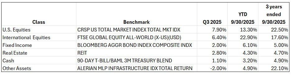 Second quarter corporate earnings were particularly strong with over 80% of reporters beating earnings estimates and over 75% beating revenue estimates. The S&P 500 increased EPS (Earnings Per Share) 12% year over year. The bar for the second quarter may have been set lower because of the uncertainty as to the impact of tariffs. However, this strong trend continued in the third quarter with the EPS beat rate at 87%, EPS growth of 9.2%, and revenue growth of 7.0%. The “Magnificent Seven” (mega-cap tech stocks) continue to drive nearly 40% of the S&P 500 growth. Analysts forecast full year 2025 earnings growth at 11% with 2026 forecasted at 13.9%. In summary, the third quarter underscores US corporate strength with some caution for overreliance on the tech giants. Stocks and bonds performed well in the third quarter. See chart below.