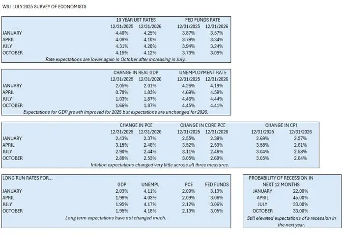 In our last economic update, we looked at market performance, the Wall Street Journal quarterly survey of economists, consumer sentiment, retail sales and the initial reports of corporate earnings for the second quarter. These same reports for the third quarter of 2025 do not show any significant changes from the second quarter.